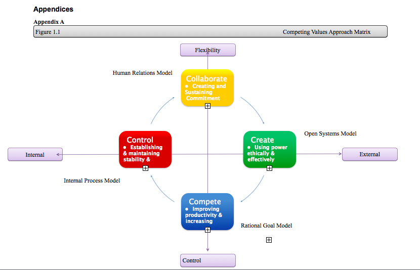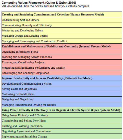 Today, management skills are commonly segmented into the competing values framework including four paradigms which have developed over time. Contingent upon environment and situation, and due to the complexities of life and technical, social and political “forces of time” several models are necessary to describe efficiency. The competing values framework includes the rational goal model (Control), the internal process model (Compete), the human resources model (collaborate), and the open systems model (Create). In order to understand yours and others values more clearly, you can read ‘Becoming a Master Manager’ (Quinn & Quinn 2011), contact me for a competing values assessment using a matrix test I have made based on Quinn & Quinn’s model, or read through the below competing values: